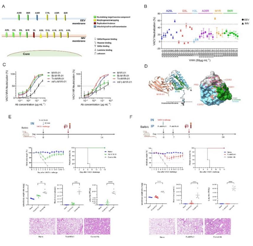 該研究針對猴痘病毒編碼的6種高度保守的免疫原膜蛋白,利用團隊自建的創新性超高多樣性全合成抗體庫技術平臺,成功篩選獲得一株靶向M1R膜蛋白的中和性納米抗體,并系統地鑒定了其抗病毒活性與親和力。該抗體能有效中和痘苗病毒及猴痘病毒。在VACV-WR株感染的Balb/c小鼠模型中,該抗體可100%保護小鼠免于死亡,并減輕疾病程度,降低病毒載量。此外,該研究還解析了納米抗體與M1R復合物的高分辨率晶體結構,揭示了該抗體新的特異性結合表位,闡明了其作用機制。目前該研究成果已申請國家發明專利。