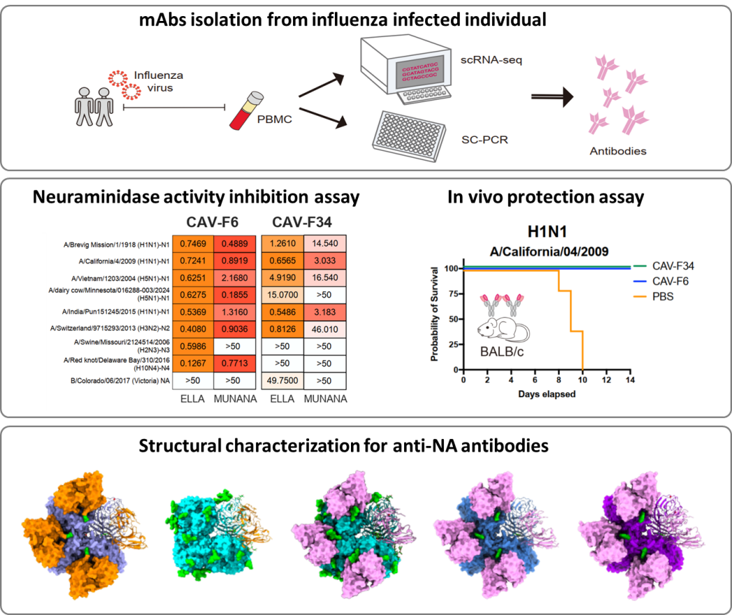 研究團隊利用單B細胞高通量抗體篩選平臺,從流感感染者體內分離出兩株廣譜性人源單抗CAV-F6和CAV-F34。這兩株抗體能高效結合數十年來流行的甲型流感(Group 1/2)和乙型流感病毒的神經氨酸酶(NA),并顯著抑制多種NA亞型的酶活性,同時對近年流行的禽流感毒株也表現出強中和活性。在動物模型中,兩株抗體對季節性流感(A/California/04/2009(H1N1)、A/Guizhou/54/1989(H3N2))的預防或治療均實現100%保護;對H7N9(A/Anhui/1/2013 (H7N9) NIBRG-268)禽流感具有顯著防護效果,且CAV-F6(20 mg/kg)對奶牛源H5N1的預防保護率達100%。